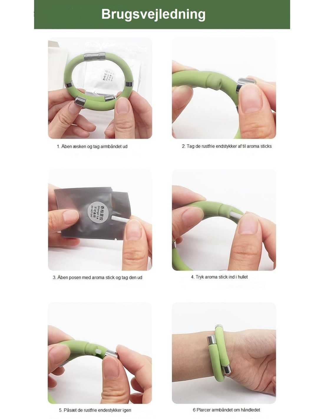 Der medfølger 4 aroma stick. Armbåndet passer til håndled mellem 16 og 19cm.